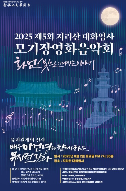 [뉴스노크=김인호 기자] 대한불교조계종 19교구 지리산대화엄사 교구장 우석스님은 2025년 제5회 지리산 대화엄사 모기장 영화음악회 “뮤지컬계의 신사 이건명 배우와 함께하는 뮤지컬 갈라”를 8월 2일 토요일 저녁 7시 30분 100분 동안 화엄원 특설 무대에서 개최한다고 밝혔다.