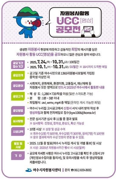 [뉴스노크=김인호 기자] 여수시는 오는 7월 24일부터 10월 31일까지 ‘2025 자원봉사활동 손수 제작물(UCC) 영상 공모’를 실시한다.