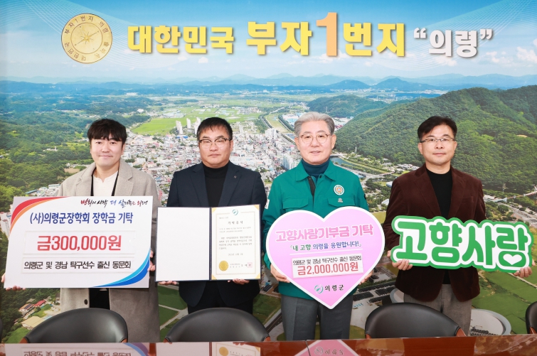[뉴스노크=김인호 기자] 의령군은 지난 1일 의령군과 경남 지역 탁구선수 출신들로 구성된 동문회가 고향사랑기부금과 (사)의령군장학회 후원금으로 총 230만원을 기탁했다고 밝혔다.
