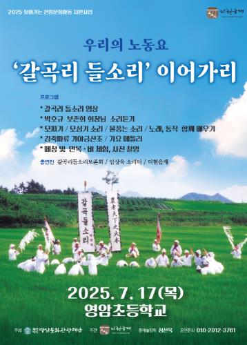 [뉴스노크=김인호 기자] (재)영암문화관광재단은 ‘2025 찾아가는 전통문화활동 지원사업’을 진행한다. 영암 문화예술단체인 더현음재와 함께 영암 초등학교 학생을 대상으로 한 “우리의 노동요‘갈곡리 들소리’이어가리”를 오는 7월 17일 제헌절에 개최한다고 밝혔다.