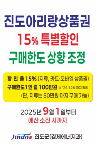 ▲ 진도아리랑상품권 15% 특별 할인! 12월까지 구매 한도 상향 |