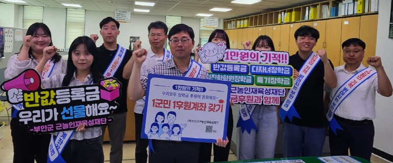 한편, 부안군근농인재육성재단은 지난 달부터 군민과 함께하는 1만원의 기적,『장학금 1군민 1후원계좌 갖기』릴레이 캠페인을 펼치고 있다. 캠페인을 통해 부안군 근농인재육성재단에 기부된 장학금은 반값등록금, 다자녀장학금, 특기장학금, 대학 비진학자 창업·취업을 위한 학원비 지원 등 꿈을 키우는 청년들을 지원하는데 쓰이게 된다.