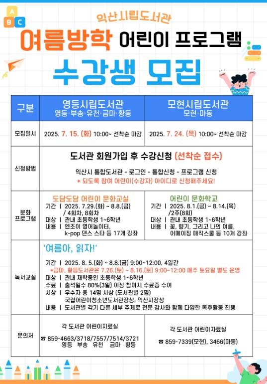 익산시는 영등·모현시립도서관에서 오는 29일부터 8월 16일까지 '초등학생 여름방학 프로그램'을 진행한다고 14일 밝혔다.