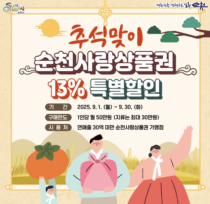 [뉴스노크=김인호 기자] 순천시는 추석명절을 맞아 9월 한 달간 순천사랑상품권 13% 특별할인 판매를 실시한다고 밝혔다.