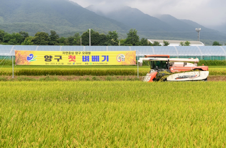 양구군은 양구읍 학조리 박봉화씨 논 2,884㎡(870여 평)에서 양구군수 등이 참석한 가운데 올해 첫 벼 베기가 진행됐다.