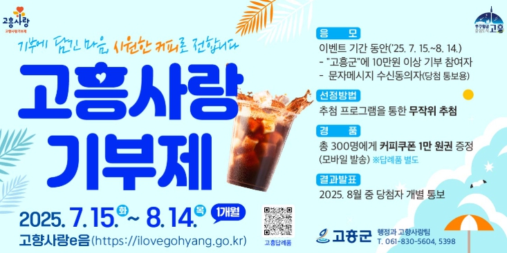 [뉴스노크=김인호 기자] 고흥군은 고향사랑기부제의 안정적인 정착과 참여 확산을 위해, 여름 휴가철을 맞아 '고향사랑기부 여름맞이 감사 이벤트'를 실시한다고 밝혔다.