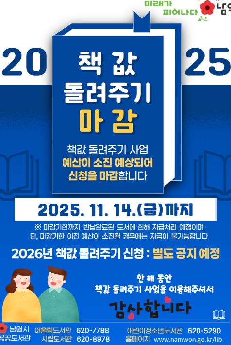 [뉴스노크=김인호 기자] 남원시는 시민들의 일상 속 독서문화 향유 기회를 확대하기 위해 추진해 온 ‘책값 돌려주기 사업’이 시민들의 높은 참여로 예산이 조기 소진됨에 따라, 올해는 11월 14일자로 마감된다고 밝혔다.