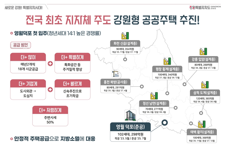 오는 14일에 준공식이 열리는 영월 덕포지구 강원형 공공주택은 도비 40억 원을 포함한 총사업비 298억 원으로 추진됐으며, 지상 18층 102세대 규모로 건립됐다.