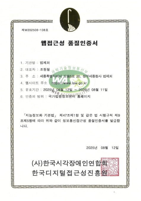 조원철 법제처장은 “이번 접근성 품질인증은 국가법령정보센터가 국민 누구나 이용할 수 있도록 노력하고 있음을 보여주는 성과”라며, “앞으로도 국가법령정보센터를 통해 모든 국민이 차별 없이 법령정보를 이용할 수 있도록 노력하겠다”라고 말했다.