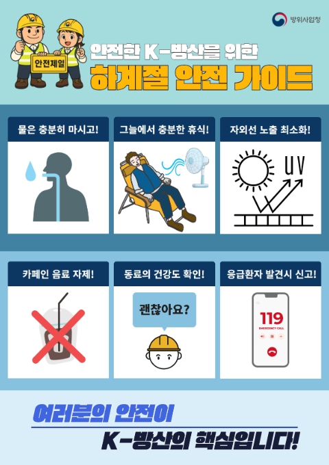 이에 따라, 방위사업청과 방산 조선소 5개 사는 작업자 온열질환 예방수칙을 담은 포스터를 제작해 배포하고, 자외선 차단을 위한 쿨링 마스크를 배부하는 등 현장 중심의 실질적인 안전사고 예방 조치를 추진했다.