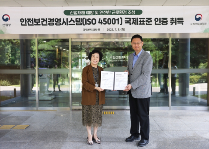 [뉴스노크=김인호 기자] 산림청 국립산림과학원은 8일, 중대재해 예방과 처벌법 대응을 위한 안전보건경영시스템(ISO 45001) 국제인증을 취득했다고 밝혔다.