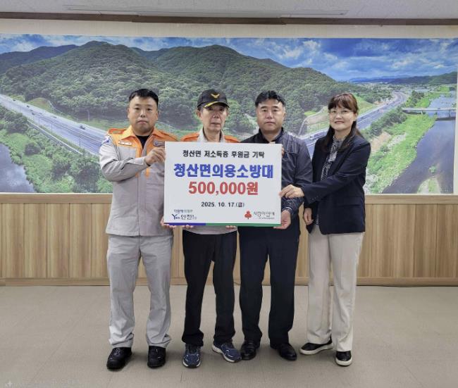 [뉴스노크=김인호 기자] 청산면의용소방대은 지난 17일 청산면행정복지센터를 방문해 지역사회 저소득층에게 따뜻한 온기를 나누고자 현금 50만 원을 기탁했다.