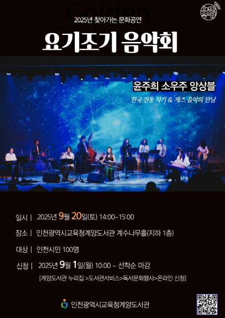 [뉴스노크=김인호 기자] 인천광역시교육청계양도서관은 오는 9월 20일 오후 2시 계수나무홀에서 ‘2025년 찾아가는 문화공연 요기조기 음악회’를 개최한다.