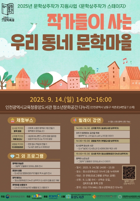 [뉴스노크=김인호 기자] 인천광역시교육청중앙도서관 청소년문화공간 다누리는 2025년 문학상주작가 지원사업 연계 프로그램 ‘문학상주작가 스테이지’를 9월 14일 오후 2시부터 4시까지 ‘작가들이 사는 우리 동네 문학마을’을 주제로 개최한다고 밝혔다.