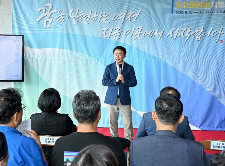 ▲ 김동근 시장이 8월 28일 ‘지오이카페’ 개소식에서 인사말을 하고 있다. |