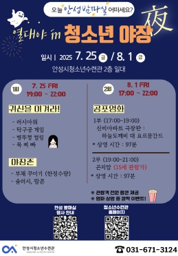 [뉴스노크=김인호 기자] 안성시청소년수련관은 오는 7월 25일과 8월 1일 2회에 걸쳐 여름방학을 맞은 청소년들을 위해 야간 체험 프로그램 ‘열대야 in 청소년 야(夜)장’을 운영한다.