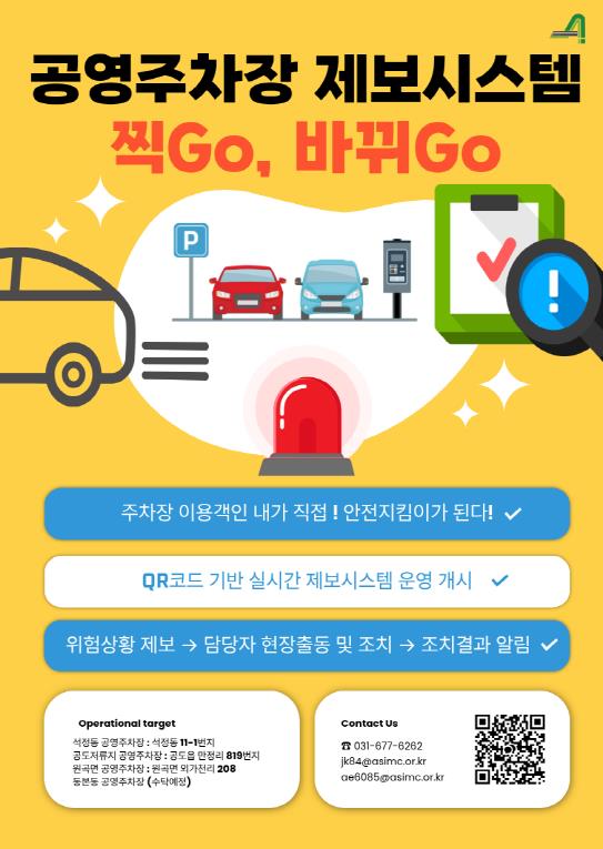 [뉴스노크=김인호 기자] 안성시시설관리공단은 10월 10일부터 원곡면, 석정동, 공도 저류지, 동본동(수탁예정)공영주차장 4개소 대상으로, 이용객이 직접 주차장의 위험요소나 이용 불편사항을 손쉽게 제보하고 개선에 참여할 수 있는 QR 코드 기반의 실시간 위험상황 제보시스템 “찍Go, 바뀌Go”를 운영한다고 밝혔다.
