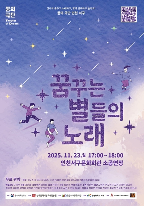 [뉴스노크=김인호 기자] 인천서구문화재단이 오는 11월 23일 오후 5시, 인천서구문화회관 소공연장에서 ‘2025년 꿈의 극단 인천 서구 정기공연 - 꿈꾸는 별들의 노래’를 개최한다.