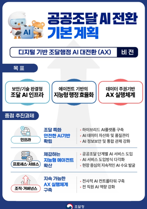 [뉴스노크=김인호 기자] 조달청은 공공조달에서 활용가능한 AI 서비스의 지속적인 발굴과 안정적이고 체계적인 서비스 제공을 위해 '공공조달 AI 전환 기본계획'을 마련했다고 19일 밝혔다.
