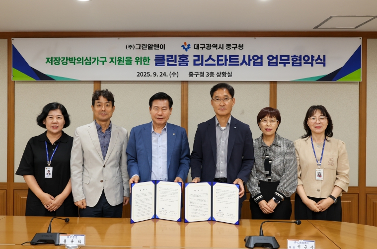 [뉴스노크=김인호 기자] 대구 중구와 ㈜그린알앤이(대표 이근수)는 24일 저장강박의심가구 주거환경 개선과 복지안전망 강화를 위한 ‘클린홈 리스타트 사업’ 업무협약을 체결했다.