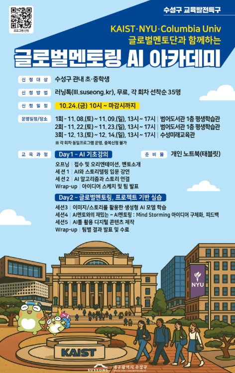 [뉴스노크=김인호 기자] 대구 수성구는 오는 11월 7일 범어도서관 김만용·박수년홀에서 ‘글로벌 교육 전문가와 함께하는 수성 AI 인재 미래교육 포럼’을 개최하고, 연계 프로그램인 AI 아카데미를 통해 미래세대를 위한 교육혁신과 글로벌 협력의 출발점을 연다.
