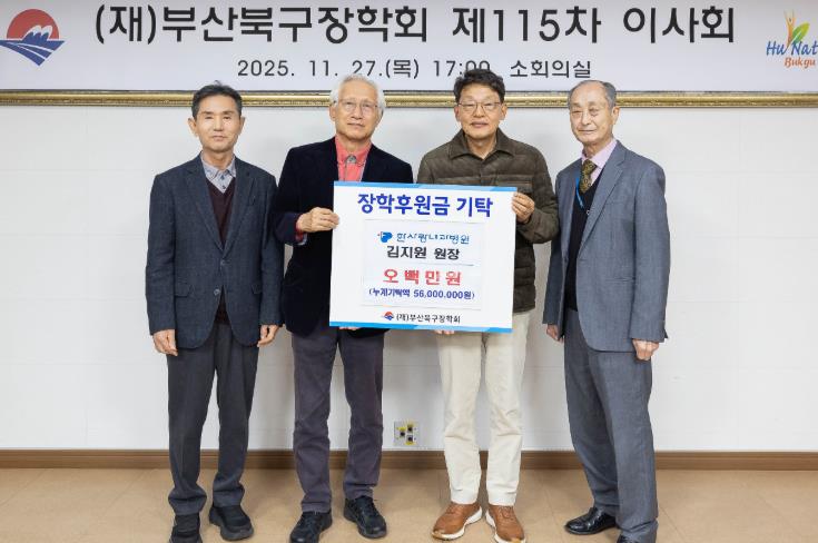 [뉴스노크=김인호 기자] 부산 북구는 최근 한사랑내과병원 김지원 원장이 (재)부산북구장학회에 장학기금 500만 원을 기탁했다고 밝혔다.
