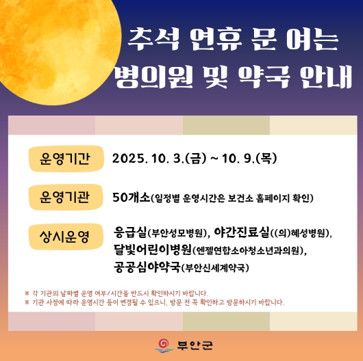 특히 지역응급의료기관인 부안성모병원은 24시간 응급실을 운영하여 응급환자 발생에 대비하고, 그 외 지정된 운영일에 병·의원, 약국 및 부안군보건소 역시 연휴 기간 중 차질 없는 의료 서비스를 제공할 예정이다.