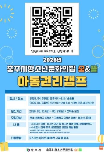 | ▲ 충주시 청소년문화의집 숨&뜰 2026년 아동권리캠프 참여자 모집 |
