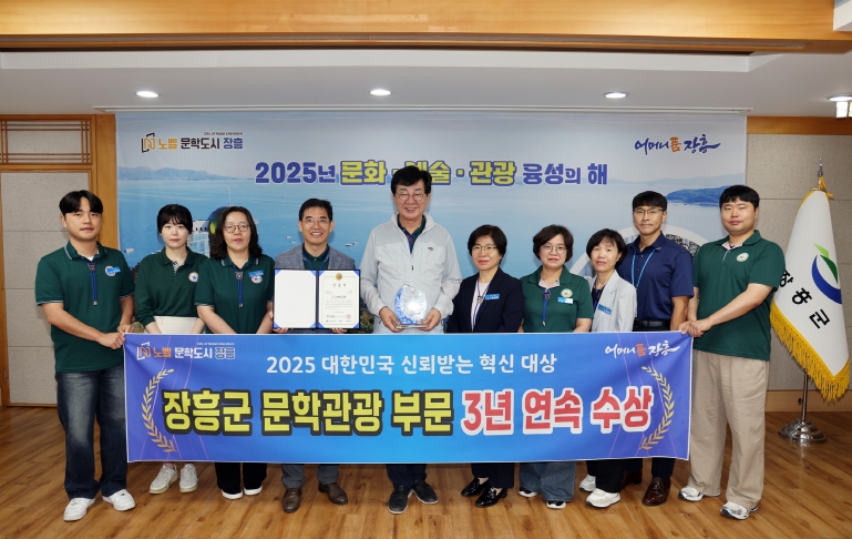 [뉴스노크=김인호 기자] 장흥군이 9월 29일 개최한 ‘2025 대한민국 신뢰받는 혁신대상’시상식에서 문학관광 부문 공공혁신 대상을 수상했다고 밝혔다.