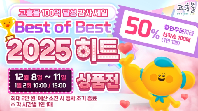 [뉴스노크=김인호 기자] 고흥군은 직영 온라인 농수축특산물 쇼핑몰 ‘고흥몰’이 누적 매출 100억 원 돌파를 기념해 오는 1월 8일부터 11일까지 ‘100억 달성 감사 세일–2025 Best of Best’ 기획전을 진행한다고 밝혔다.