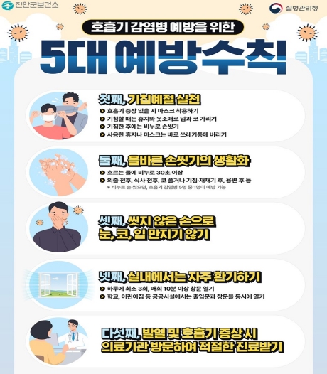이에 군은 호흡기감염병 예방을 위해 △흐르는 물에 비누로 30초 이상 손 씻기 △기침이나 재채기 시 옷소매로 입과 코 가리기 △예방접종 하기 △발열‧기침 등 증상 발생 시 마스크 착용 및 외출 자제 △호흡기 증상이 있을 경우 의료기관 방문 전 먼저 전화 상담하기를 당부했다. 또한 실내에서는 자주 환기하고, 다수가 모이는 밀폐·밀집 환경에서는 마스크 착용을 권고하며, 고위험군(영유아·어르신·임산부·만성질환자 등)은 증상 발현 시 신속한 진료를 받을 것을 안내했다.