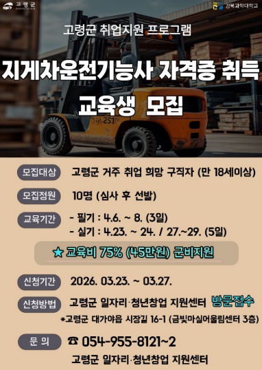 [뉴스노크=김인호 기자] 고령군은 구직자의 취업 역량강화를 위해 '고령군 일자리·청년창업지원센터'주관으로 지게차운전기능사 취득 지원사업 교육생을 모집하고 있다.