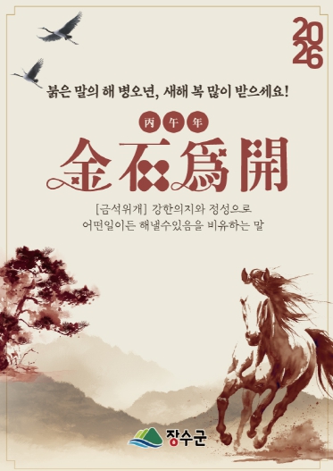 [뉴스노크=김인호 기자] 장수군은 2026년 병오년(丙午年) 새해를 맞아 군정 운영의 방향을 담은 신년 사자성어로 ‘금석위개(金石爲開)’를 선정했다.