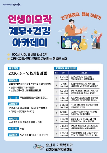 [뉴스노크=김인호 기자] 순천시는 중·장년층의 삶의 설계와 안정적인 노후 준비를 돕기 위해 ‘재무·건강 아카데미’ 수강생을 3월부터 7월까지 수시 모집한다고 밝혔다.
