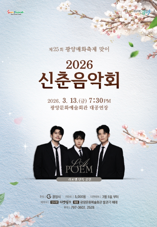 [뉴스노크=김인호 기자] 광양시는 오는 3월 13일 오후 7시 30분 광양문화예술회관 대공연장에서 제25회 광양매화축제의 시작을 알리는 '2026 신춘음악회'를 개최한다.