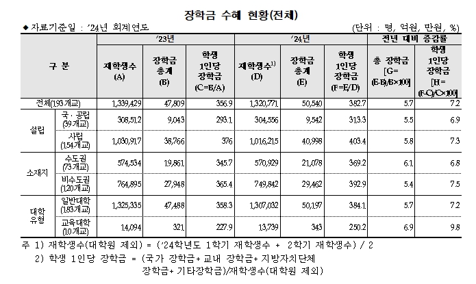 2024년 일반 및 교육대학의 장학금 총액(결산 기준)은 5조 540억원으로 전년(4조 7,809억원) 대비 2,731억원(5.7%) 증가했다.