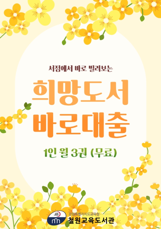 1인 월 3권씩 신청 가능하며, 신청 대상은 철원교육도서관 소속 대출회원으로 서점 바로대출 권수도 전체 대출권수에 포함되며 14일간 대출(연장불가) 할 수 있다.