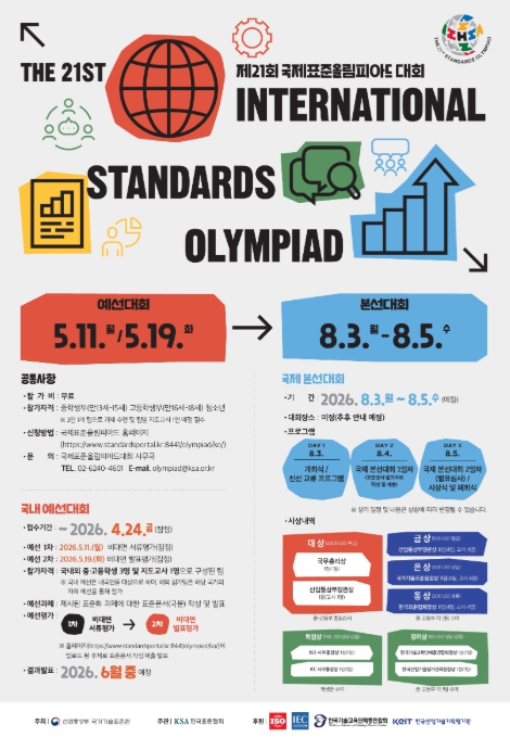 [뉴스노크=김인호 기자] 산업통상부 국가기술표준원은 금년 8월에 개최되는 세계 청소년 표준화 경진대회인 '제21회 국제표준올림피아드'에 참가할 한국대표팀 선발을 위해 3월 5일부터 국내 예선대회 참가팀 모집을 시작한다.