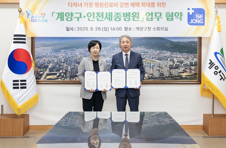 [뉴스노크=김인호 기자] 인천광역시 계양구는 9월 29일 인천세종병원(병원장 오병희)과 ‘다자녀 가정 병원진료비 감면 확대’를 위한 업무협약을 체결했다.