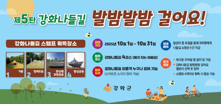 [뉴스노크=김인호 기자] 강화군은 10월 한 달간 강화나들길 활성화를 위해 ‘제5탄 강화나들길 발밤발밤 걸어요!’ 챌린지를 진행한다고 밝혔다.