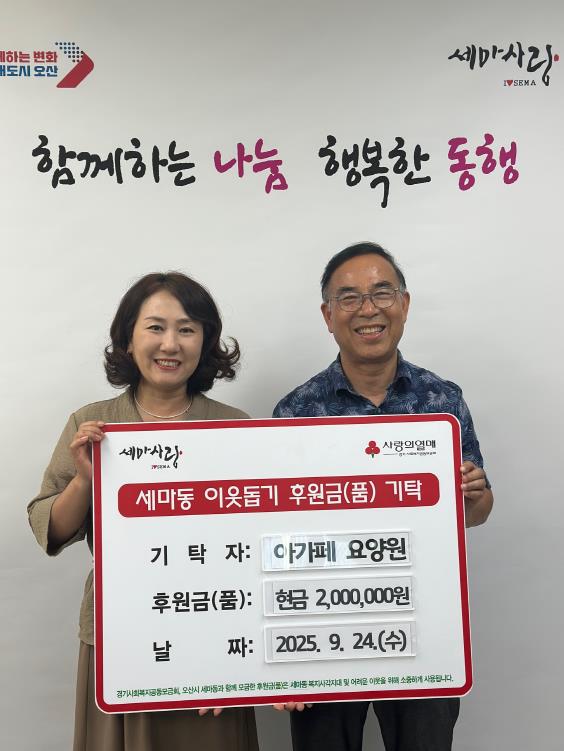 이번 기탁은 어려운 이웃들에게 작은 보탬이 되고자 하는 아가페 요양원의 따뜻한 뜻에서 마련됐으며, 전달된 성금은 세마동 행정복지센터를 통해 복지 사각지대에 놓인 주민들을 지원하는 데 사용될 예정이다.