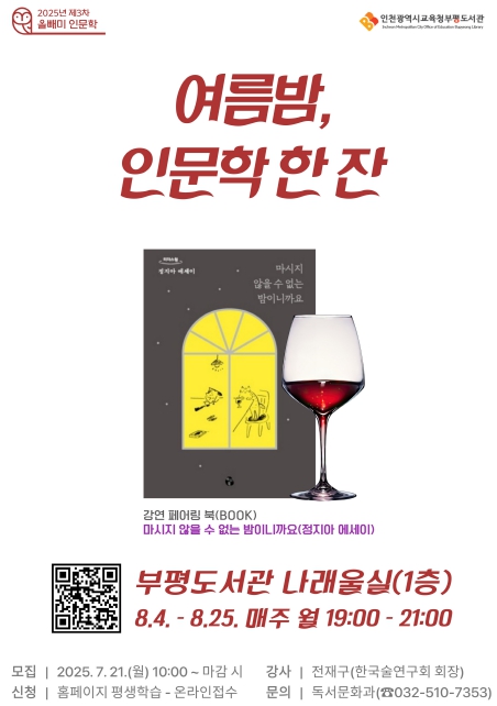 [뉴스노크=김인호 기자] 인천광역시교육청부평도서관은 오는 8월 4일부터 25일까지 매주 월요일 오후 7시, 제3차 올빼미 인문학 강연 '여름밤, 인문학 한 잔'을 4회에 걸쳐 운영한다.