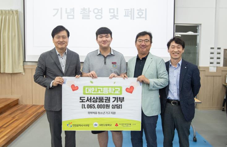 [뉴스노크=김인호 기자] 인천 서구는 지난 18일 대인고등학교 학생 313명이 쓰레기 줍기 활동으로 마련한 1,065,000원 상당의 도서상품권을 취약계층 청소년에게 기부했다고 21일 밝혔다.