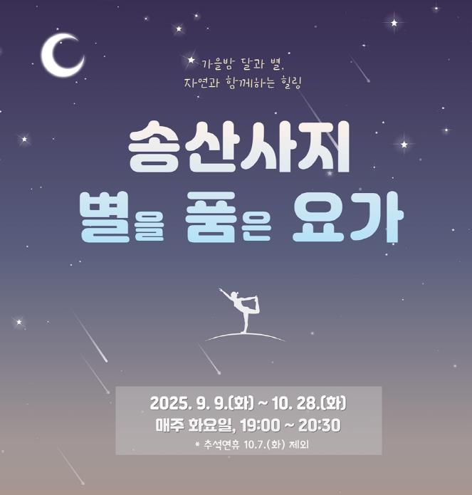 특히 가을밤 별빛 아래 열리는 야외 요가는 요가매트를 지참하면 시민 누구나 참여할 수 있다. 자연 속에서 즐기는 특별한 경험으로 많은 관심이 기대된다.