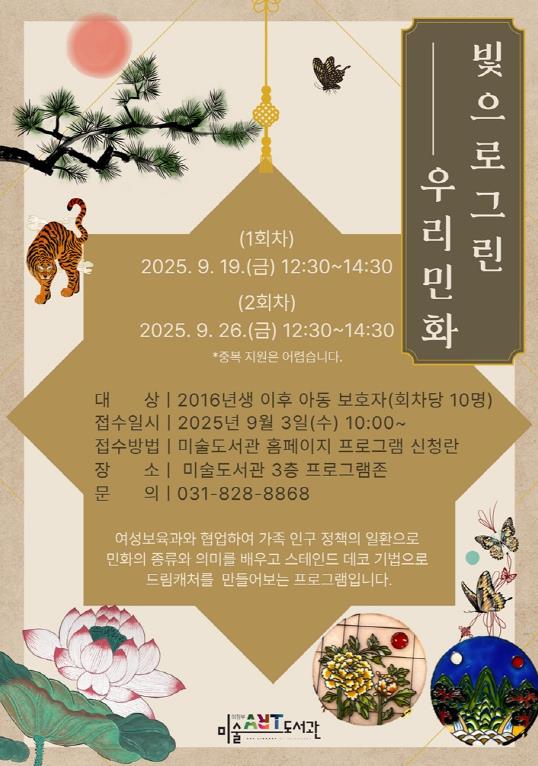 프로그램은 9월 19일과 26일 두 차례에 걸쳐 의정부미술도서관에서 ▲민화의 종류와 의미 배우기 ▲스테인드 데코 드림캐처 만들기로 진행된다. 참가비는 무료이며, 자녀(2016년 이후 출생)가 있는 부모 또는 보호자라면 누구나 신청할 수 있다.