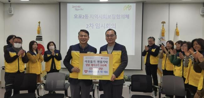 오포2동에 따르면 지난 5일 오포2동 노인회 김종배 분회장이 성금 30만 원을 기탁했다. 김 분회장은 매년 꾸준히 성금을 전달해 온 것으로 알려졌다. 이어 지난 6일에는 오포2동 체육회 상임이사로 활동 중인 오피스안 안겸제 대표가 행정복지센터를 방문해 성금 50만 원을 전달했다. 안 대표는 지난해 12월에도 성금 100만 원을 기탁한 바 있다.
