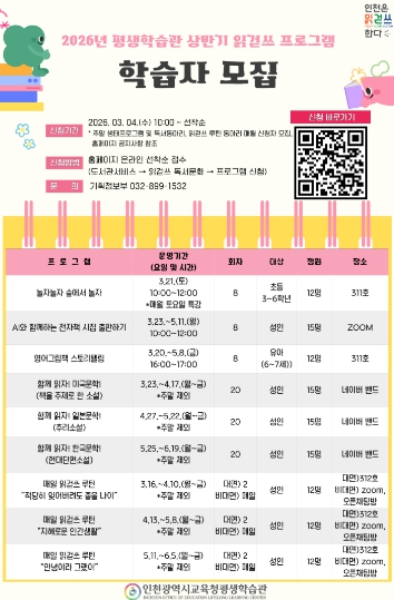 [뉴스노크=김인호 기자] 인천광역시교육청평생학습관은 오는 4일부터 ‘상반기 읽걷쓰 프로그램 학습자’를 모집한다.