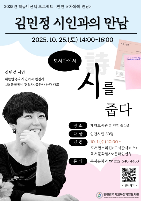 [뉴스노크=김인호 기자] 인천광역시교육청계양도서관은 10월 25일 오후 2시 ‘책동네산책 프로젝트’의 일환으로 ‘김민정 시인과의 만남’을 개최한다.