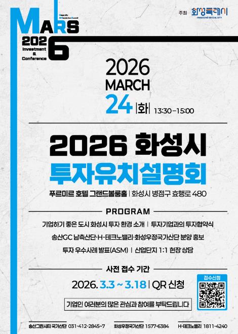 [뉴스노크=김인호 기자] 화성특례시가 오는 3월 24일 푸르미르 호텔에서 ‘2026 화성특례시 투자유치 설명회’를 개최하고, 3월 3일부터 3월 18일까지 QR코드를 통한 사전접수를 진행한다.