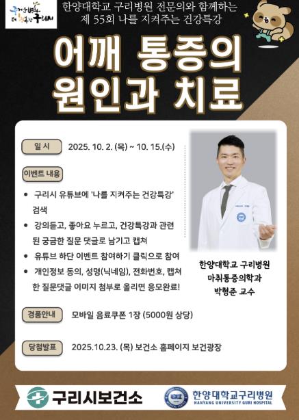 [뉴스노크=김인호 기자] 구리시는 오는 10월 2일, 시민들의 근골격계 질환 예방과 건강관리 역량 강화를 위해 '어깨 통증의 원인과 치료'를 주제로 한양대학교 구리병원 마취통증의학과 박형준 교수와 함께하는 ‘나를 지켜주는 건강특강’을 구리시 공식 유튜브 채널(구리비전)을 통해 송출한다고 밝혔다.
